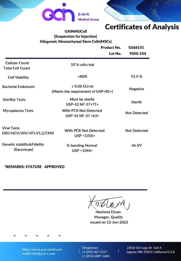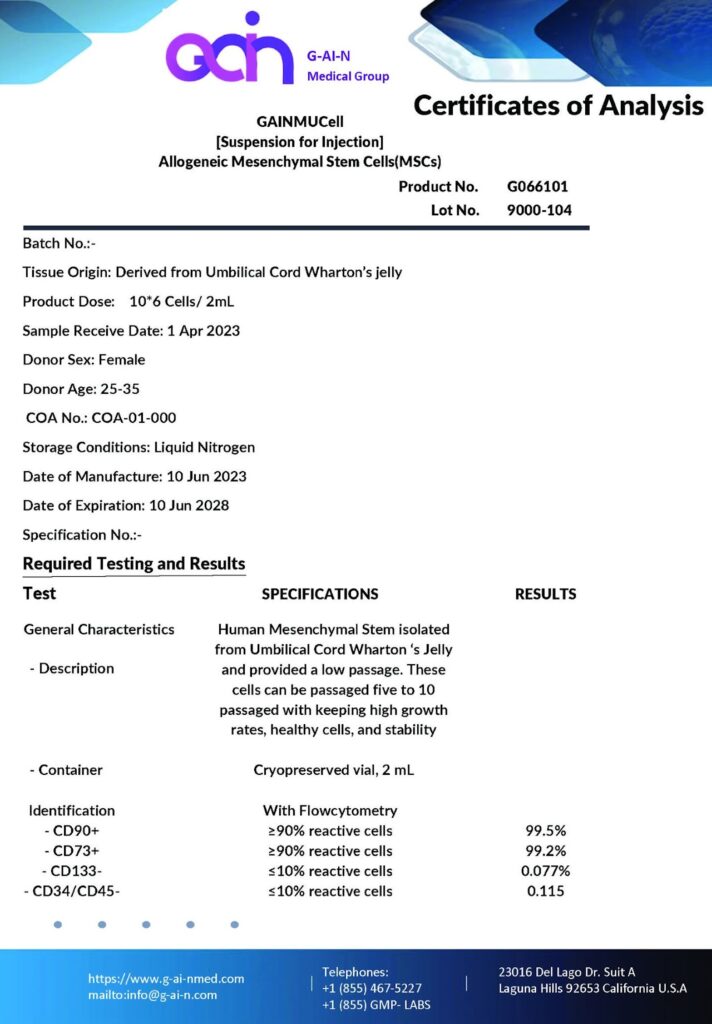 Every parameter measured in GainMed’s comprehensive testing protocol not only meets but often exceeds industry standards. The high mesenchymal stem cell purity, exceptional vitality, guaranteed sterility, maintained undifferentiation, and confirmed genetic stability all contribute to the superior quality of GainMed’s stem cell products. These results are a testament to GainMed’s meticulous approach to product quality, ensuring that their stem cell therapies are safe, effective, and ready to meet the rigorous demands of modern regenerative medicine.
